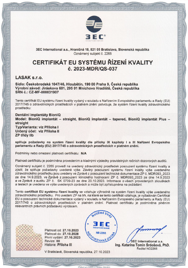 Die Firma LASAK entwickelte unter der Führung von Ing. Jakub Strnad, Ph.D., eine einzigartige Oberflächentechnologie, die eine dreidimensionale makro-, mikro- und nanostrukturierte, hydrophile Titanoberfläche mit bioaktiven Eigenschaften, bezeichnet auch als BIO-Oberfläche, bildet. Experimentelle und insbesondere klinische, breit dokumentierte Ergebnisse bestätigten, dass die Zahnimplantate mit der BIO-Oberfläche den Prozess der Osseointegration bedeutend beschleunigen und qualitativ verbessern sowie die Stabilität des Implantates in der kritischen Anfangsphase der Einheilung optimieren. Dies führt zur besseren Vorhersagbarkeit und Erfolgsrate der Therapie und ermöglicht den Einsatz neuer progressiver klinischer Protokolle, die Früh- sowie Sofortbelastung der Implantate umfassen.