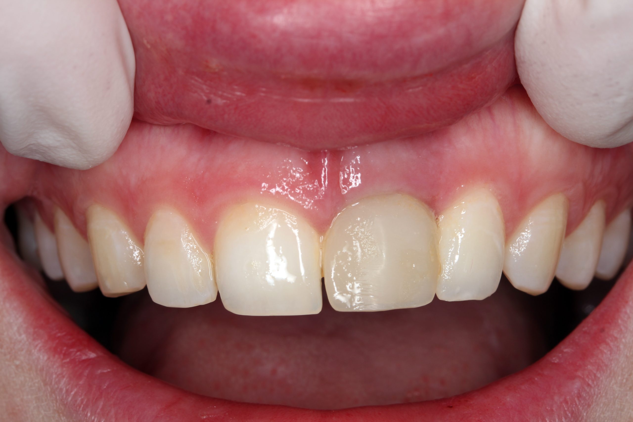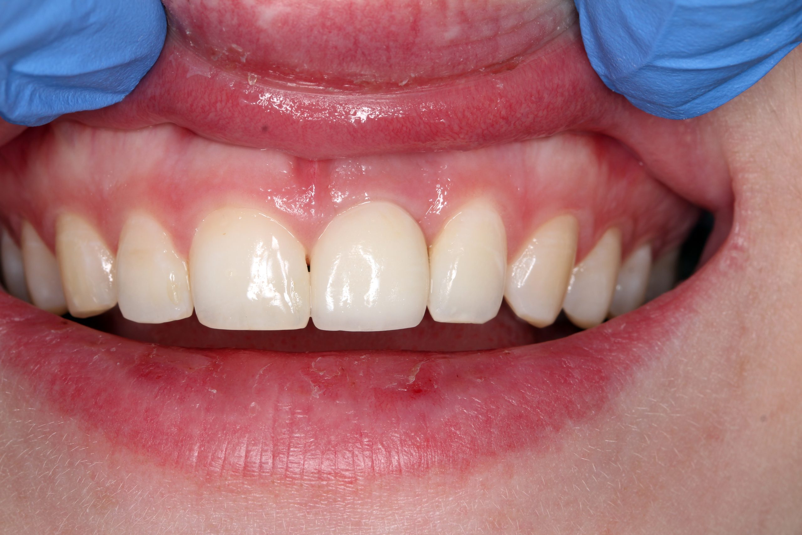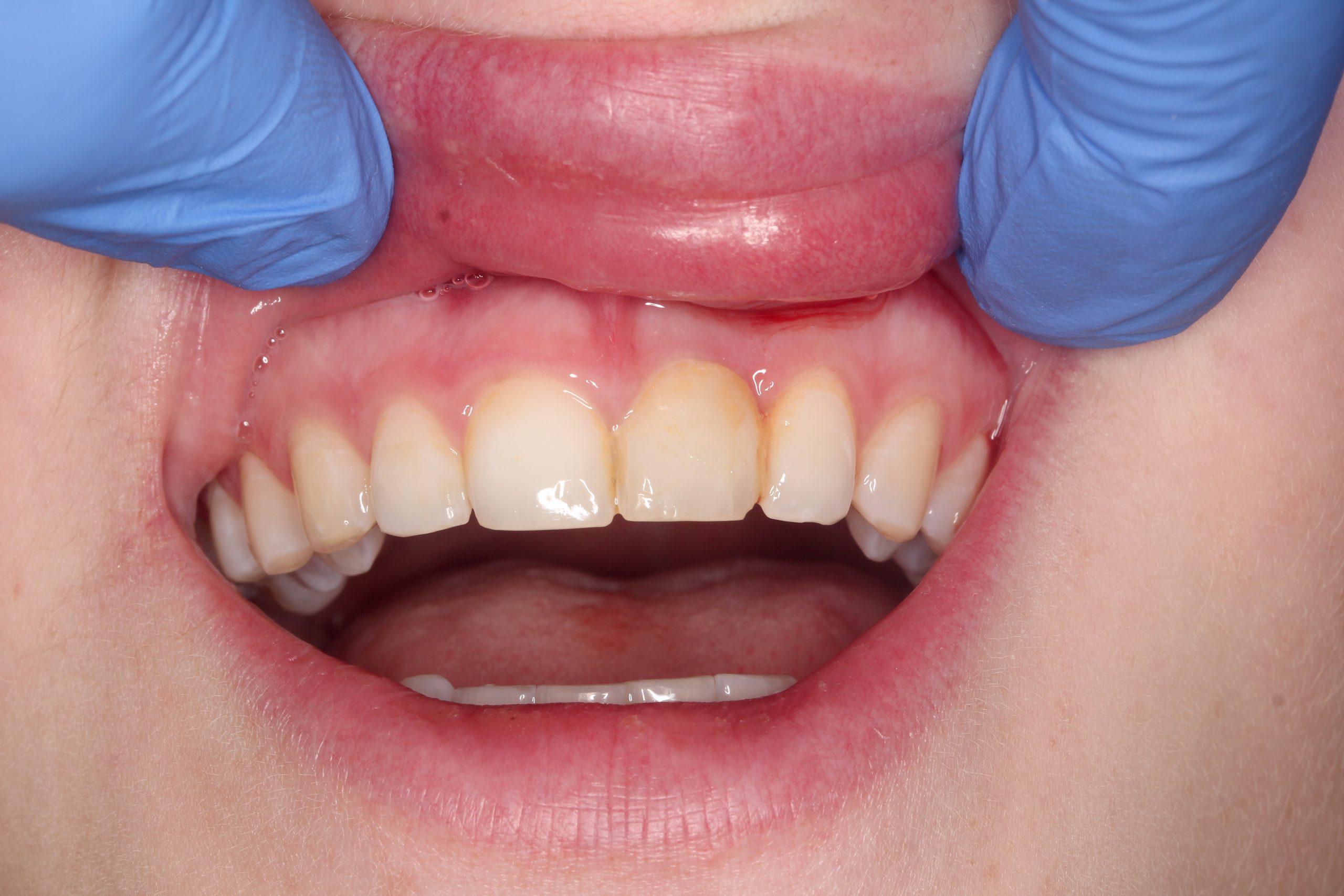 Eine 18-jährige Patientin klagte über eine wiederkehrende Fistel am Zahn 21. Bei einem Fahrradunfall vor fünf Jahren hatte sie sich eine Verletzung der Oberlippe und eine Subluxation des linken oberen Schneidezahns zugezogen. Nachdem das Weichgewebe genäht und der Zahn 21 repositioniert worden war, wurde sie von ihrem Zahnarzt weiterbehandelt. Vor vier Jahren kam es zu einer Verfärbung des Zahns. Mehrere endodontische Behandlungen folgten. Da der Zahn wackelte, wurde er mit den umgebenden Zähnen mittels eines Komposits verblockt.