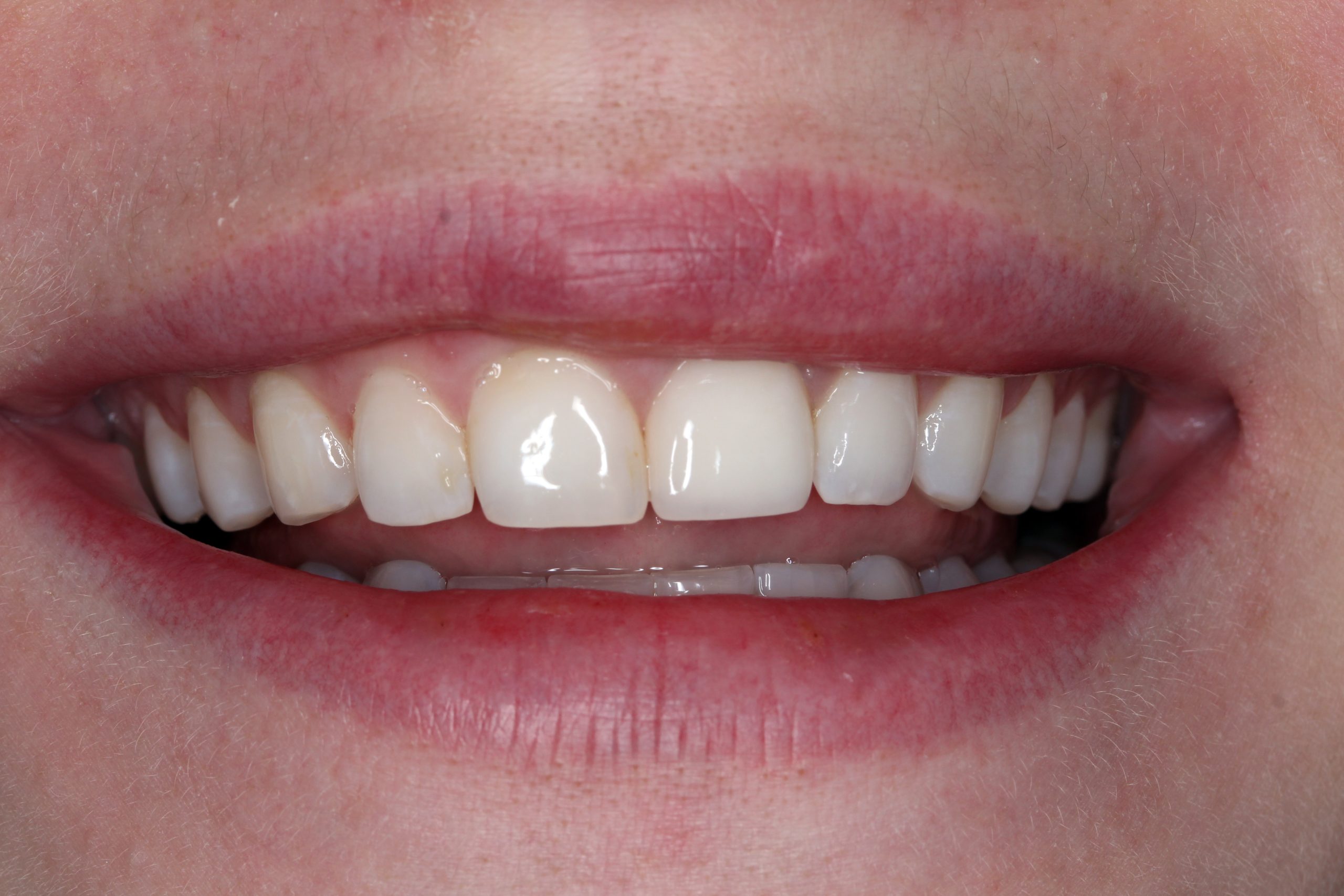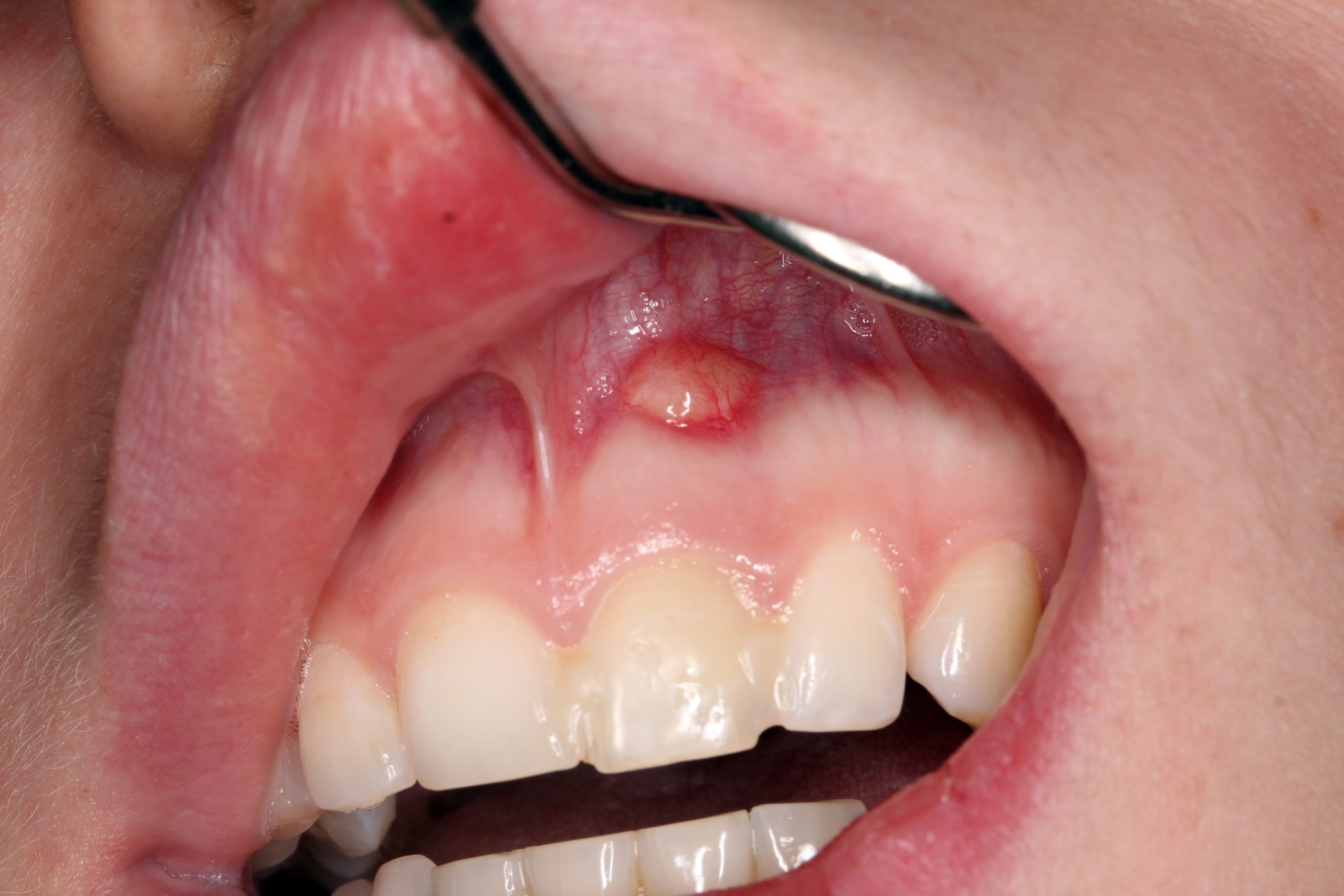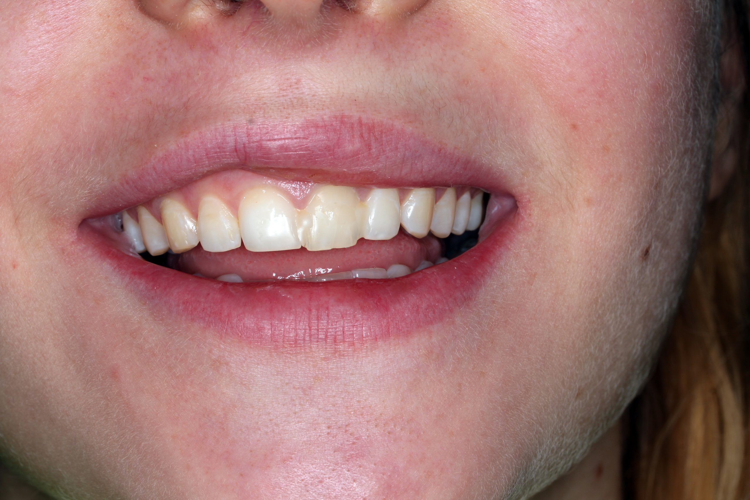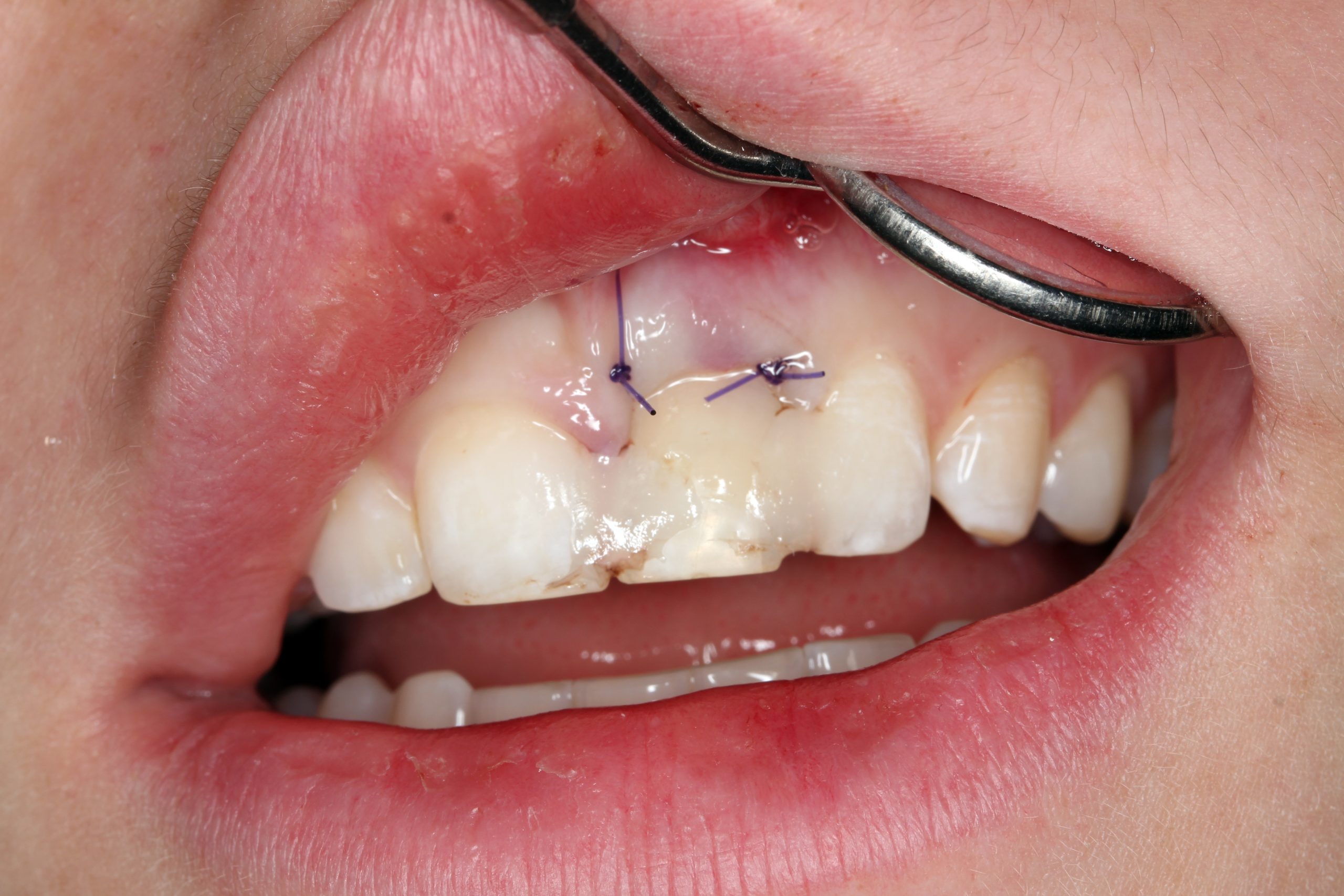Eine 18-jährige Patientin klagte über eine wiederkehrende Fistel am Zahn 21. Bei einem Fahrradunfall vor fünf Jahren hatte sie sich eine Verletzung der Oberlippe und eine Subluxation des linken oberen Schneidezahns zugezogen. Nachdem das Weichgewebe genäht und der Zahn 21 repositioniert worden war, wurde sie von ihrem Zahnarzt weiterbehandelt. Vor vier Jahren kam es zu einer Verfärbung des Zahns. Mehrere endodontische Behandlungen folgten. Da der Zahn wackelte, wurde er mit den umgebenden Zähnen mittels eines Komposits verblockt.