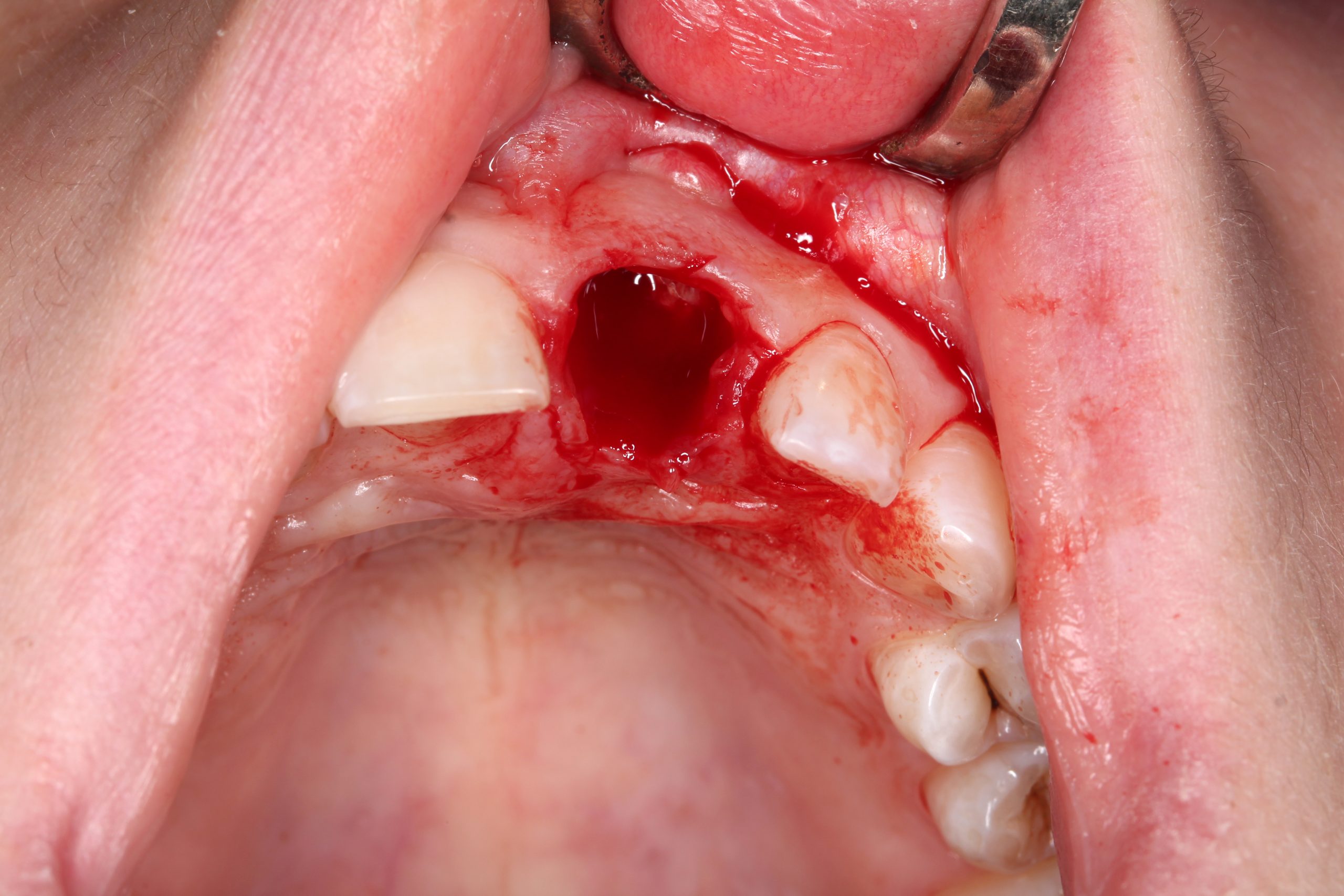 Nach der Extraktion und Exkochleation wurde die Extraktionswunde revidiert. Die vestibuläre Wand der Alveole war bis auf den apikalen Teil erhalten. Das Zahnbett wurde nur mit einem antibiotikahaltigen Kollagenkegel aufgefüllt.