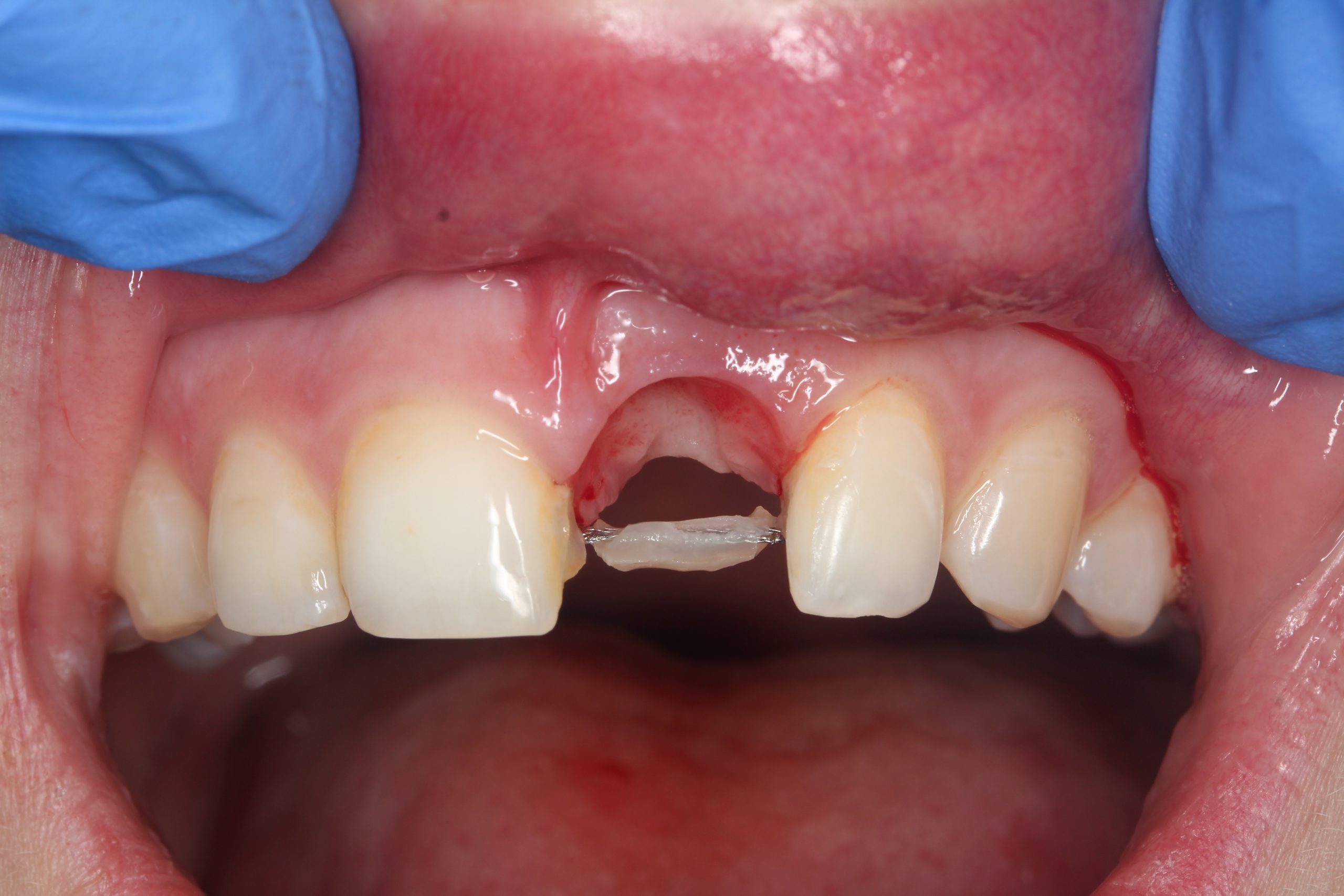 Der extrahierte Zahn diente als Provisorium. Die Wurzel wurde etwa 2 mm unterhalb der SZG abgeschnitten, sodass dieser Teil im Weichgewebe eingebettet war. Die Krone wurde mit Komposit an den Nachbarzähnen befestigt.