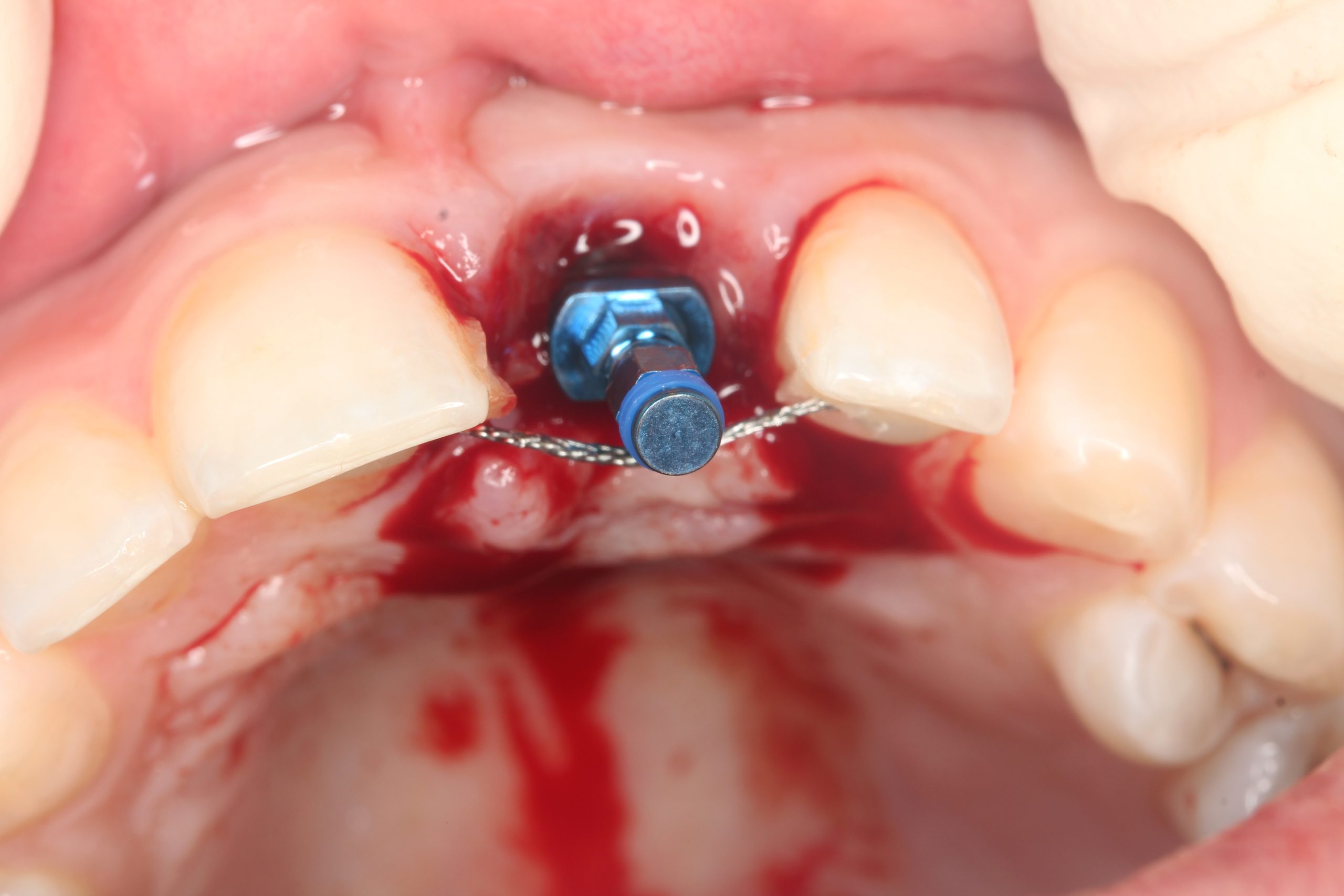 Der Mukoperiostlappen wurde palatinal angehoben und teilweise vestibulär mobilisiert. Ein 14 mm langes Implantat BioniQ® von LASAK mit Ø 4 mm wurde eingesetzt und nach dem Entfernen des Trägers ein provisorischer Aufbaupfosten befestigt.